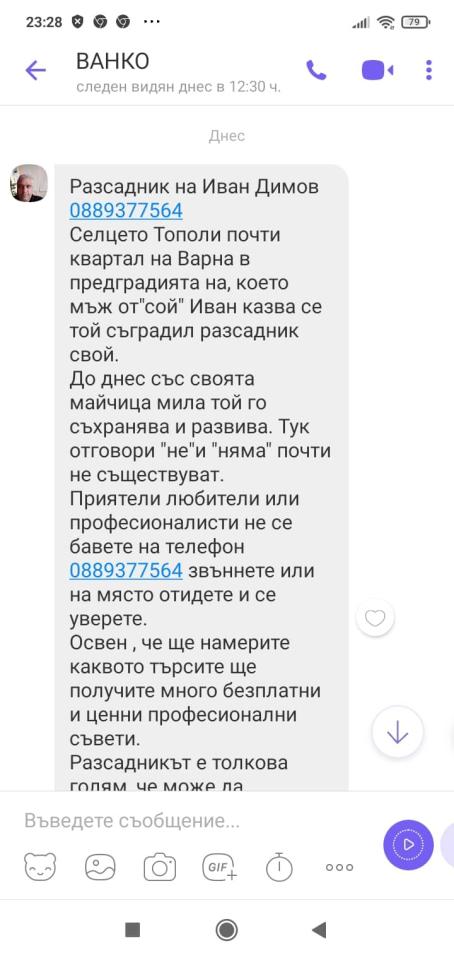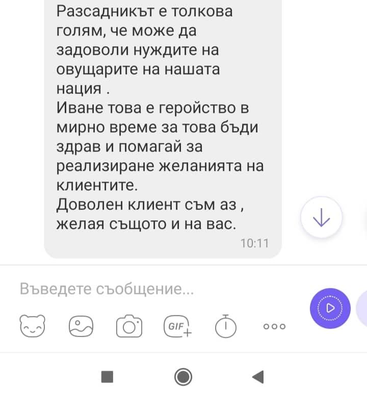 За Вас уважаеми клиенти в Лицензиран овощен разсадник "Иван Димов" - Варна професионално, отговорно и с желание се трудят , както млади хора, така и такива с доказан опит в сферата на земеделието и отглеждането на овощен посадъчен материал. Ежедневно мониторинг на дейността и качеството на работа в разсадника се извършва от неговия ръководител г- н Иван Димов. НСРЗ - Варна ежегодно контролира воденето на Дневници за проведени химически обработки и употребени торове, подобрители на почвата и биологични активни вещества, както и Дневници за взетите проби и извършените анализи от растенията и растителните продукти. Гаранция за произвоството на качествен овощен посадъчен материал са използваните разрешени за употреба продукти за растителна защита; регистрираните торове и подобрители на почвата.