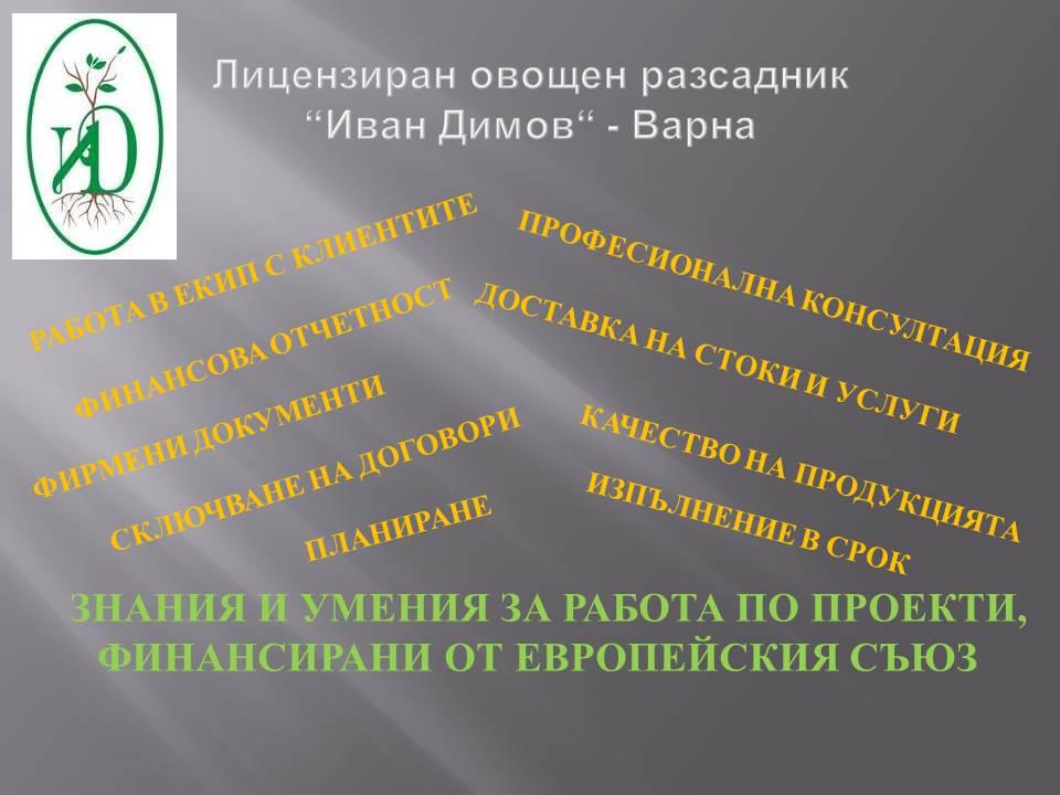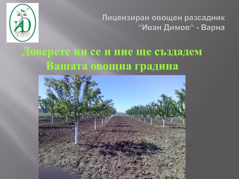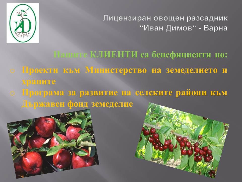 Лицензиран овощен разсадник“Иван Димов“ – Варна предлага на своите клиенти професионална консултация и партньорство в работата по европейски проекти и програми в областта на земеделието.Ръководството на разсадника оказва съдействие при сключване на договори с избрания доставчик, изготвяне на задължителните документи, както и допълнителна информация по време на реализиране на Вашите проекти.Качеството на посадъчния материал гарантира и ефективната реализация на проекта. Традиционно клиенти на разсадника са бенефициенти по европейски проекти към Министерство на земеделието и храните и Държавен фонд земеделие.Екипът от специалисти в разсадника ще ви предложи професионална консултация и технически опит в производството на овощен посадъчен материал, както и сертификат за здравния статус на продукцията.