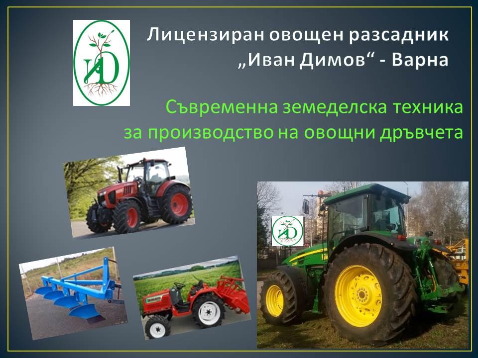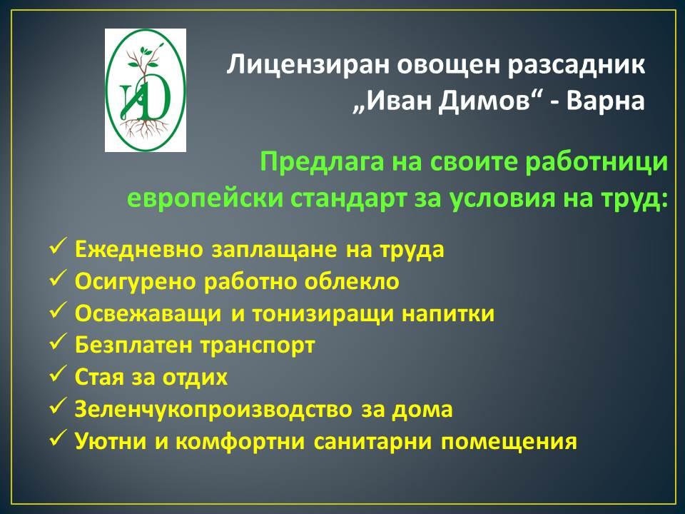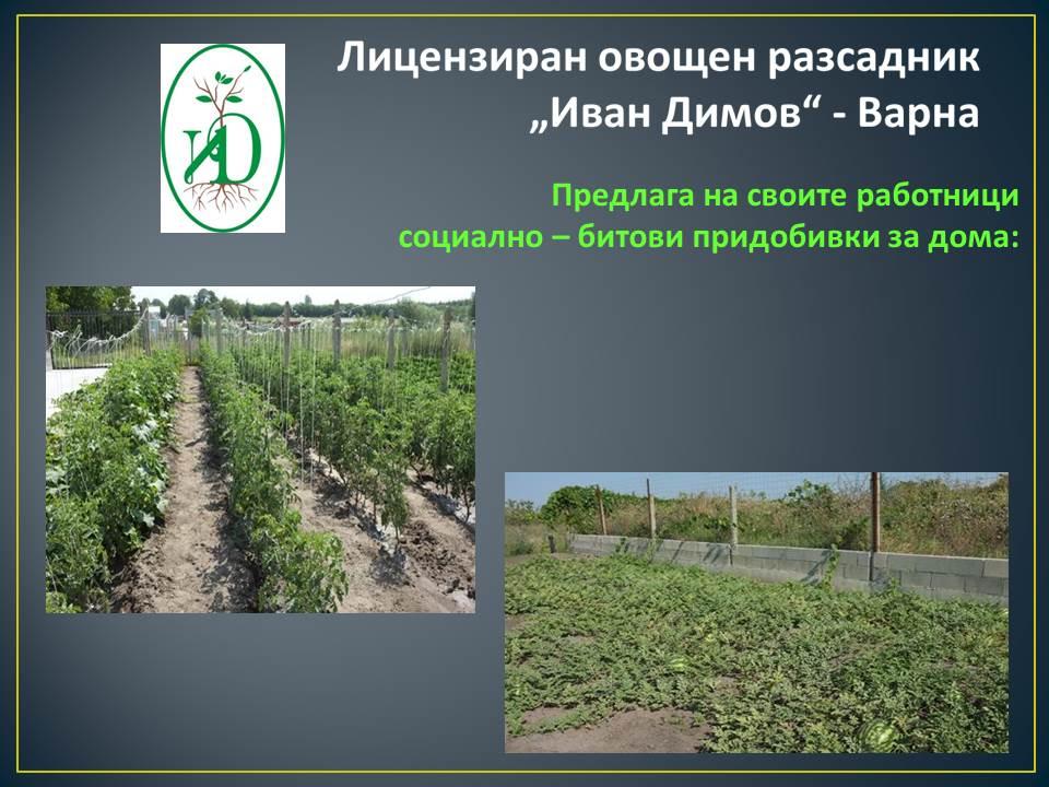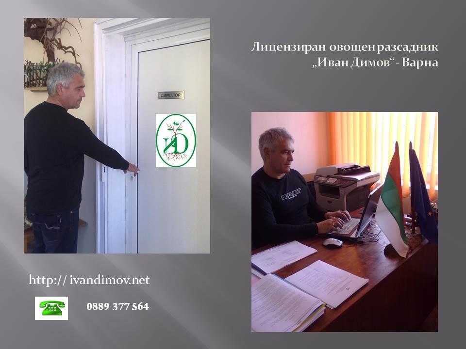 Лицензиран овощен разсадник "Иван Димов" - Варна се ръководи от Иван Димов.Традиционно и иновативно управление съчетано с богат професионален опит, научни познания и спазване на държавната политика в областта на фитосанитарния контрол.Разсадникът е вписан в официалните регистри за фитосанитарен контрол под индивидуален регистрационен номер, даващ възможност за неговата идентификация. Ежегодно качеството на продукцията се удостоверява с официален фитосанитарен сертификат (растителен паспорт). Управлението на разсадника се отличава с богатия технически опит на неговия ръководител в производството на овощен посадъчен материал и свързаните с него фитосанитарни въпроси. За реализиране на дейността на разсадника работи екип от специалисти в областта на земеделието, маркетинга и търговията. Разсадникът притежава съвременна земеделска техника и модерно техническо обслужване за производство на овощни дръвчета.